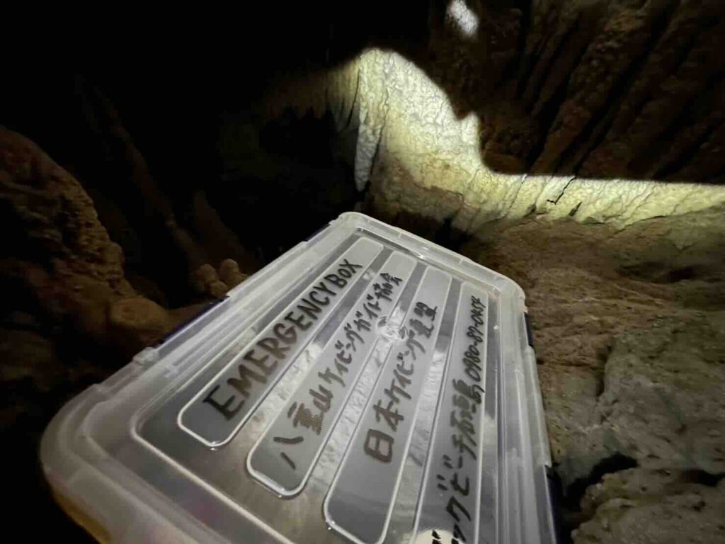 作業内容:洞窟内部残地用エマージェンシーボックス交換作業